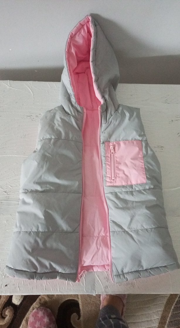 Kapüşonlu, fermuarlı, içi pembe astarlı gri kız çocuk yeleği. Casual sokak tarzı için uygun, kolsuz ve dar kesim. Çift taraflı kullanılabilir.