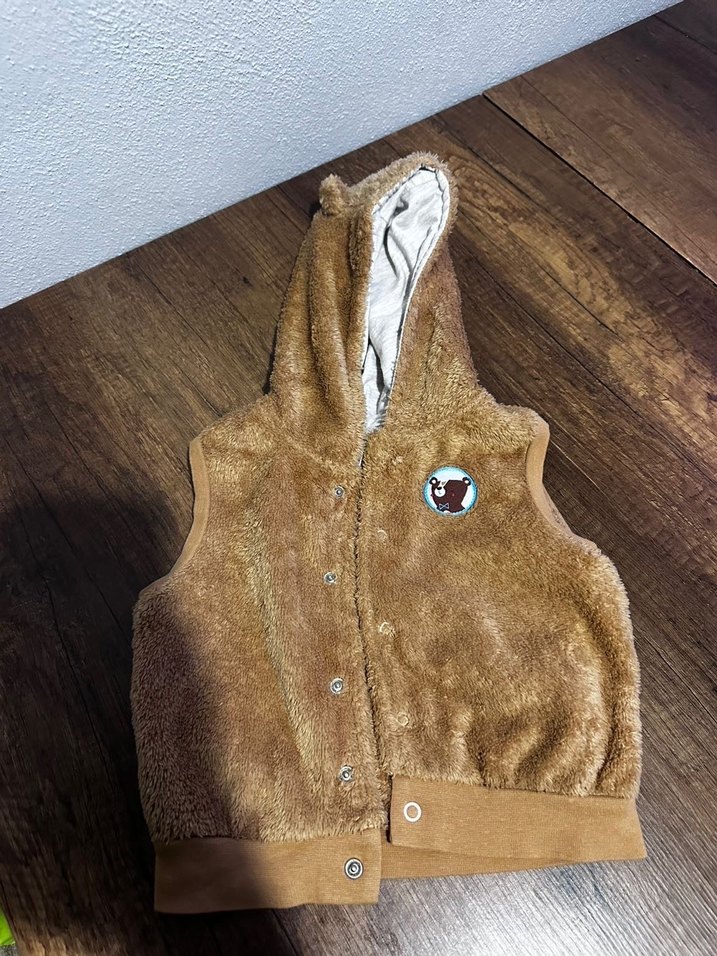 Kahverengi, kapüşonlu ve kürklü detaylı, yumuşak ve sıcak dokulu kız çocuk yeleği. Kolsuz ve dar kesim, günlük sokak stili için uygundur.