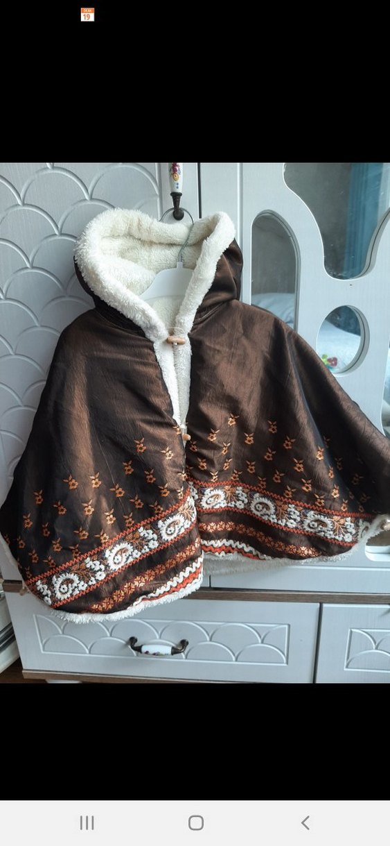 Kapüşonlu, uzun kollu, bol kesim kız çocuk pançosu. Koyu kahverengi, nakışlı ve içi kürklü, bohem tarzda retro bir görünüm sunar.