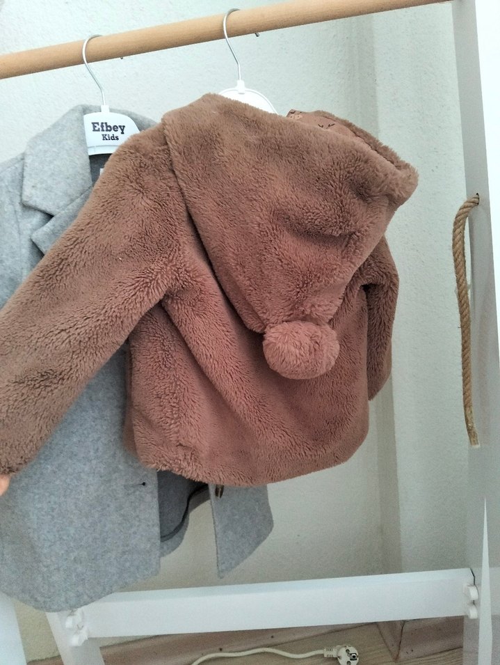 Kız çocukları için kapüşonlu, kahverengi, peluş dokulu, bol kesim mont. Kapüşonunda ponpon detayı ve baskılı desen bulunur. Rahat ve sade tarzda. alt dugmesi yoktur fotograf da oldugu gibi