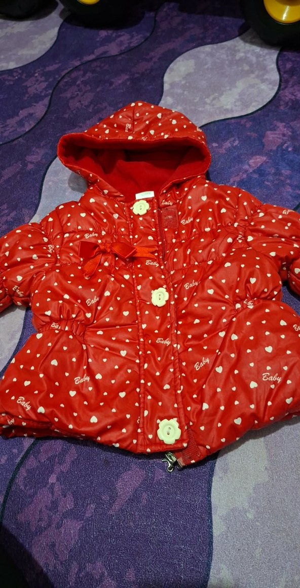 Kız çocuk için kapüşonlu, düğmeli, yumuşak ve sıcak kumaştan yapılmış kırmızı baskılı, renkli ve dar kesim mont.