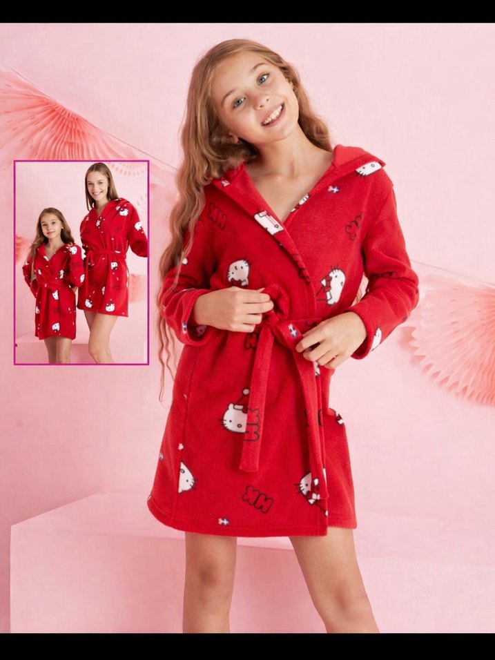 Kız çocukları için kapüşonlu, yumuşak ve sıcak dokulu kırmızı baskılı sabahlık . Ayarlanabilir kemer ve rahat ceplere sahiptir. 4-14 yaş arası stoklarda