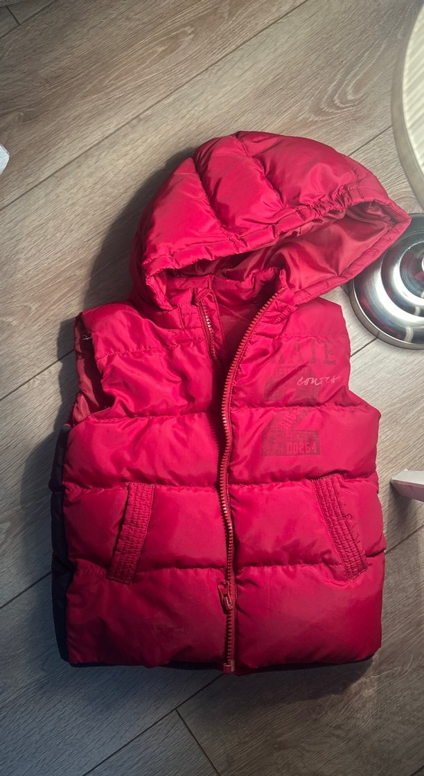 Kırmızı renkte, kapüşonlu, fermuarlı ve yüksek yakalı kız çocuk yeleği. Yumuşak ve sıcak kumaştan, trend sokak stili için uygun.