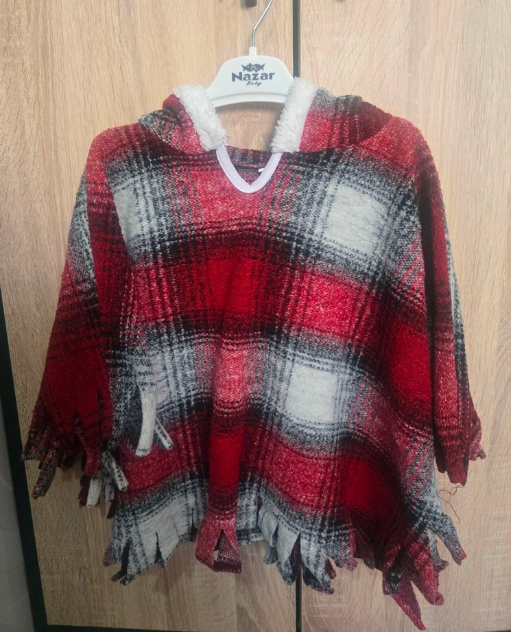 Kız çocukları için kapüşonlu, uzun kollu, bol kesim örgü panço. Yumuşak, sıcak kumaştan yapılmış kırmızı ve gri batik desenli, püsküllü kenar detaylı.