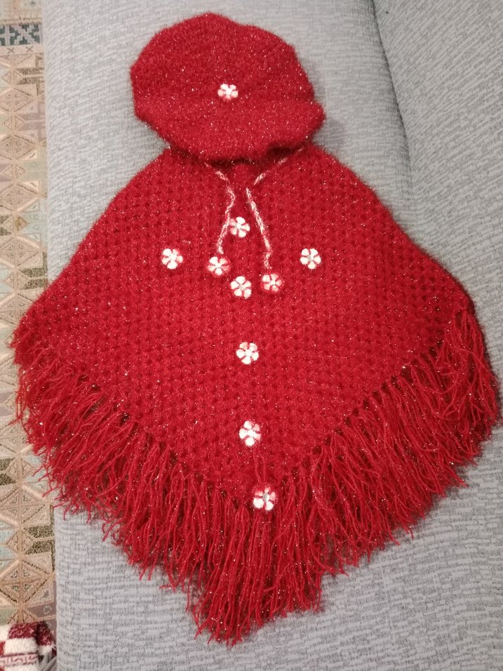 Kız Çocuk Kapüşonlu Kırmızı Örgü Panço