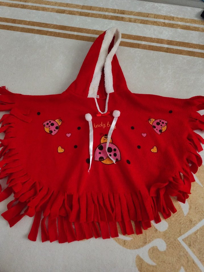 Kapüşonlu, püsküllü kenarlı ve işlemeli uğur böceği desenli renkli kırmızı kız çocuk pançosu. Salaş kesim ve kolsuz, bohem tarzda.