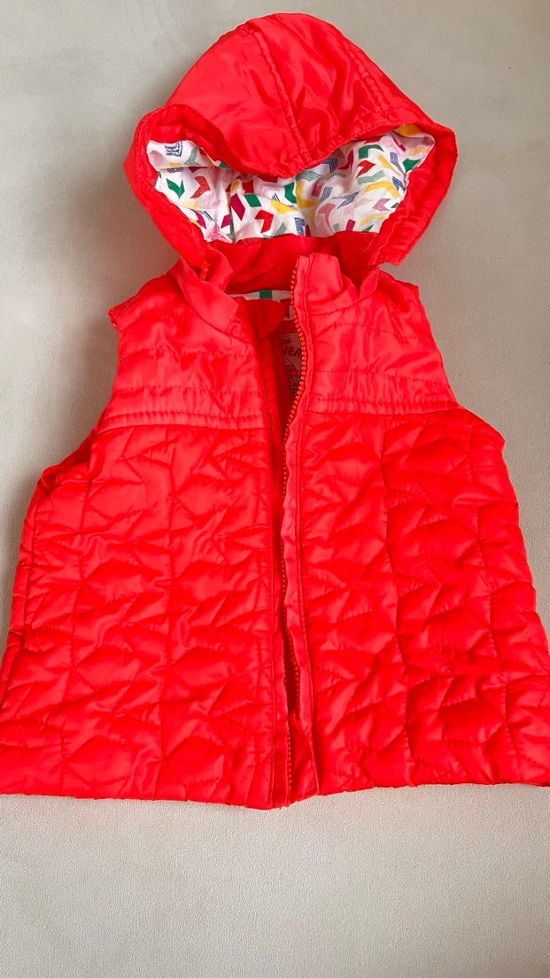 Kız çocukları için kapüşonlu, yüksek yakalı ve fermuarlı kırmızı yelek. Renkli iç kapüşon astarı ve dar kesimiyle sıcak tutan yumuşak kumaştan üretilmiştir.