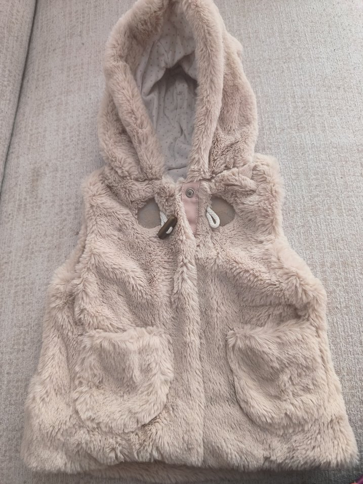 Kız çocuklar için kapüşonlu, kolsuz, bej renkli, kürk detaylı ve dar kesim yelek. İki ön ceplidir, sade ve düz tasarıma sahiptir.