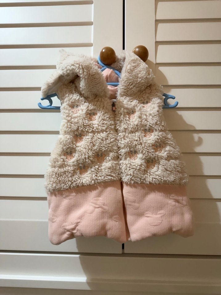 Kapüşonlu, kolsuz kız çocuk yeleği, yumuşak kürk detayları ve pastel pembe kapitone kumaşla rahat ve şık bir görünüm sunar.