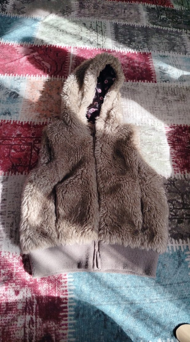 Kız çocuk kapüşonlu, yumuşak kürk detaylı, bol kesim, kahverengi ve gri tonlarında, kolsuz yelek. Bohem tarzına uygun.