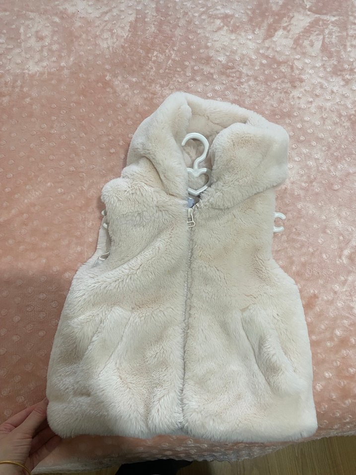 Kız çocukları için kapüşonlu, kürklü detaylı, bej renkte, yumuşak ve sıcak tutan kumaştan yapılmış, dar kesim kolsuz yelek. Sokak giyimine uygun. Yurtdisi urunudur primark marka tertemiz