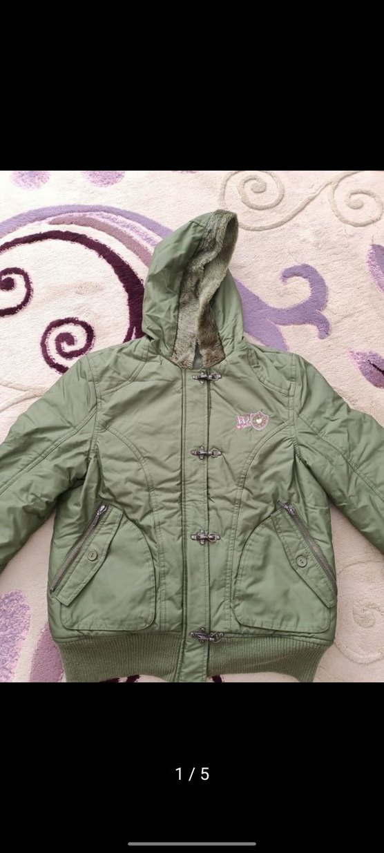 Kapüşonunda yumuşak kürk detayları bulunan, yeşil renkli, fermuarlı ve düğmeli kız çocuk montu. İki cep ve ribanalı bilekler rahat bir kullanım sağlar.