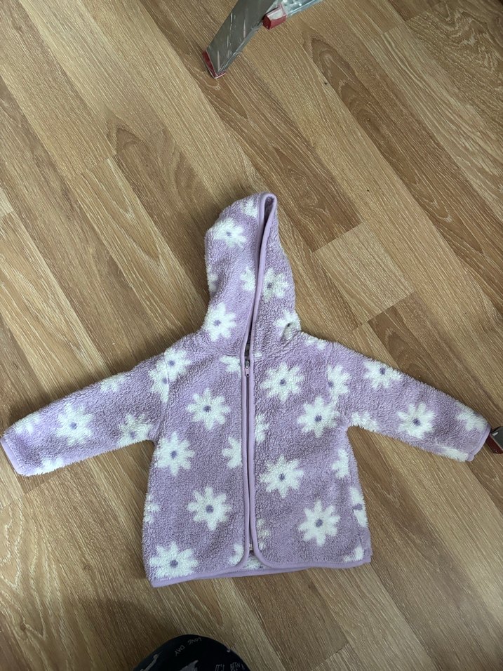 Kapüşonlu, lila tonlarında beyaz çiçek desenli, örme kumaştan yapılmış kız çocuk ceket. Fitted kesim ve streetwear tarzında tasarlanmıştır.