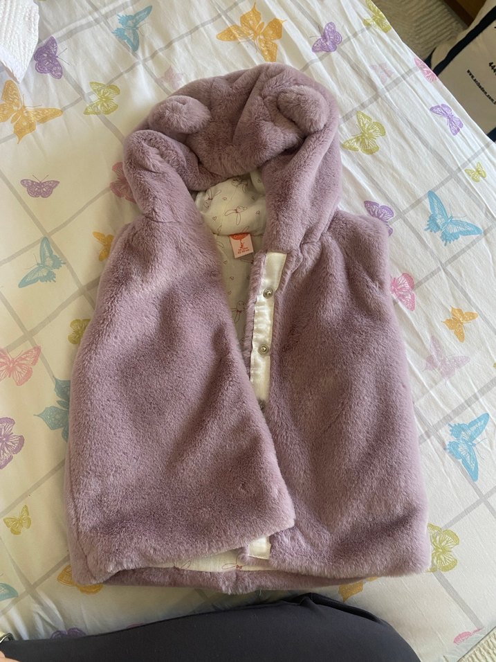 Kapüşonlu, peluş detaylı, pastel mor renkte, fitted kesim kız çocuk yeleği. Kolsuz ve düz tasarıma sahiptir.