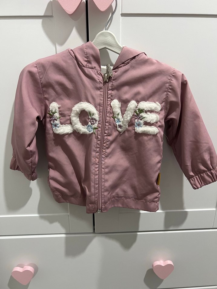 Rahat kesim, kapüşonlu pembe ceket, önünde nakışlı 'LOVE' yazısı ve fermuar bulunur. Yumuşak kumaştan, günlük sokak stiline uygun.