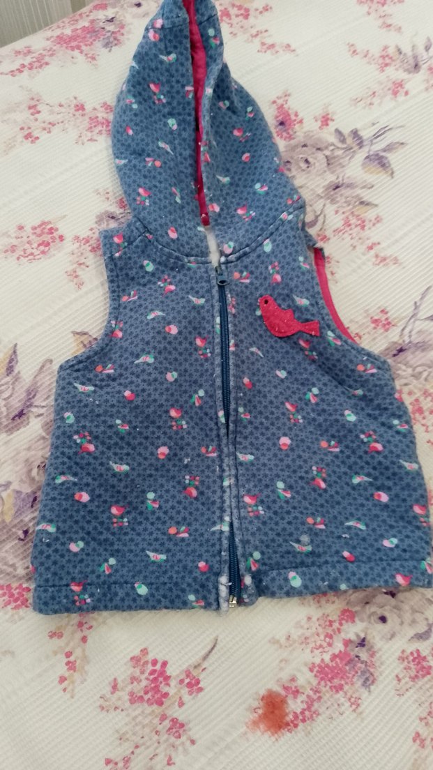 Kız çocukları için kapüşonlu, fermuarlı ve nakış detaylı, yumuşak ve sıcak kumaştan yapılmış, renkli desenlere sahip fitted kesim yelek.