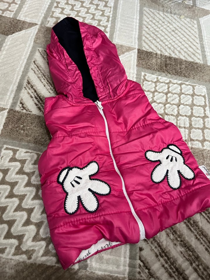 Kız çocukları için kapüşonlu, fermuarlı, nakışlı ve renkli detaylara sahip pembe kolsuz yelek. Rahatlık için yumuşak kumaş kullanılmıştır.