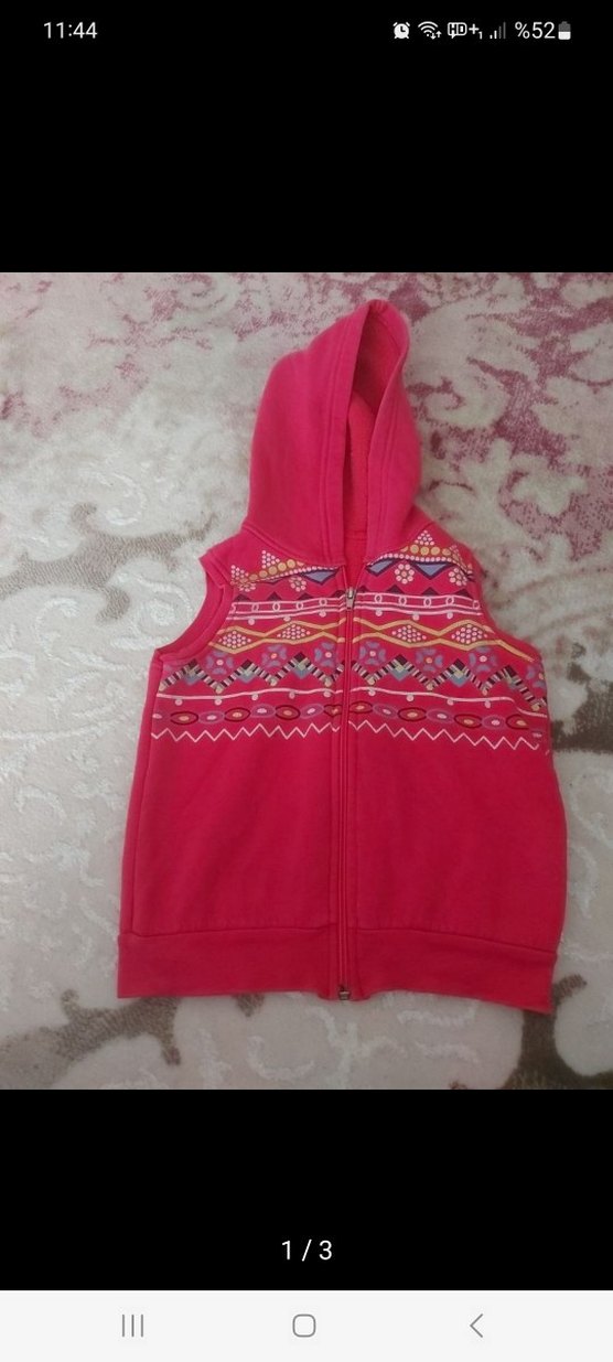 Pembe kapüşonlu, renkli nakışlı ve fermuarlı kız çocuk yeleği. Yumuşak ve sıcak kumaştan, bohem sokak tarzına uygun kesim.