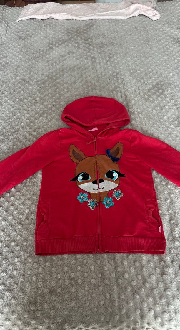 Kız çocukları için kapüşonlu, nakış detaylı, yumuşak ve sıcak kumaştan yapılmış kırmızı renkli, detaylı ince kesim sweathirt hırka.