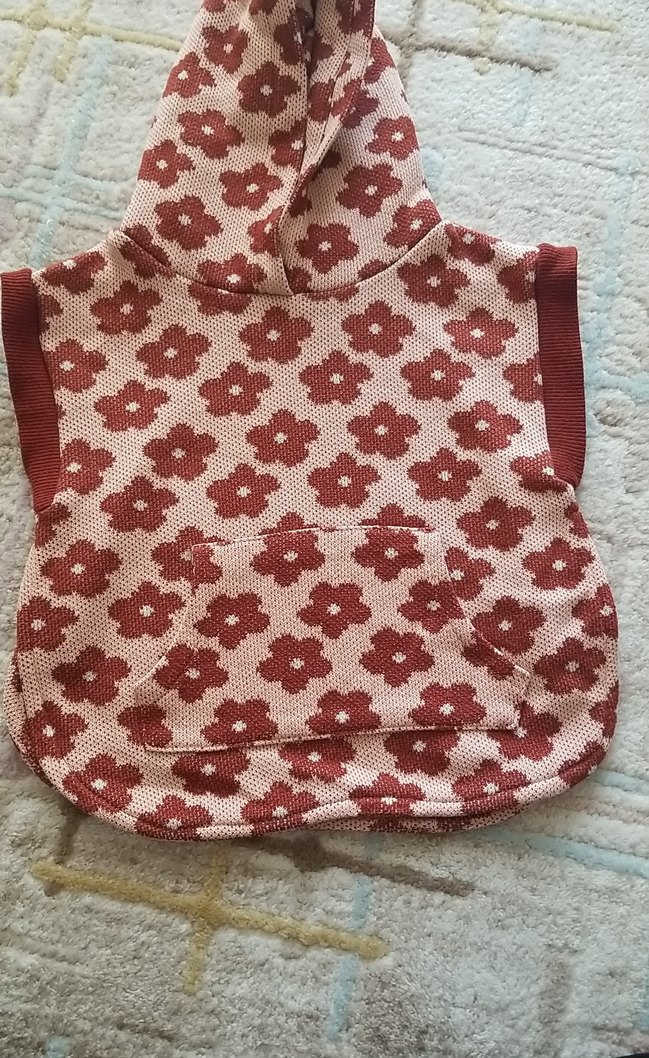 Kapüşonlu, kolsuz örgü panço. Bordo çiçek desenli, yumuşak tekstil kumaştan, bol kesim ve bohem tarzda.