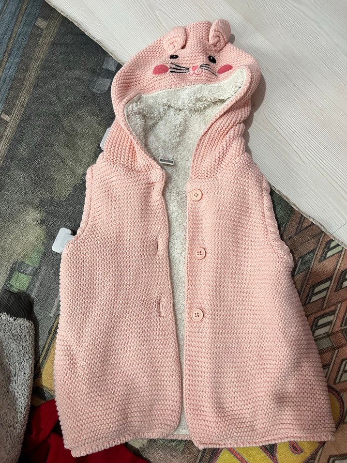 Pembe renkli, kapüşonlu ve örgü dokulu kız çocuk yeleği, sevimli nakışlı hayvan detaylarına sahip. İç kısmı yumuşak ve sıcak, rahat sokak stili için uygun.