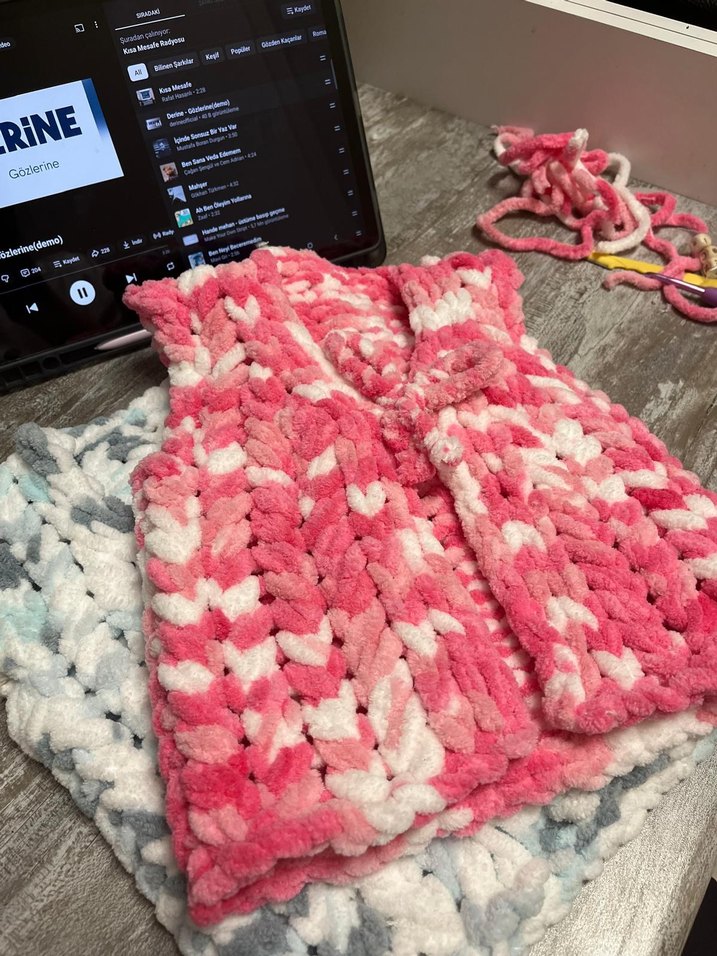 Renkli pembe, kapüşonlu, kolsuz kız çocuk yeleği, örgü ve batik desenli, bohem tarzda, vücuda oturan kesime sahiptir.