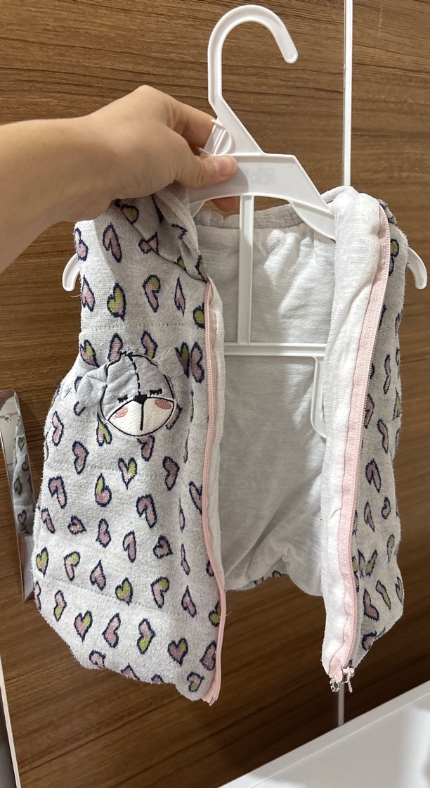 Pamuklu, fermuarlı ve V yaka kız çocuk yeleği. Gri renkli, kalıplı ve kalp desenli, rahat sokak stili için uygundur. 15 aylık kızıma dar geliyor . 9 aydan sonra kullanıma uygun .