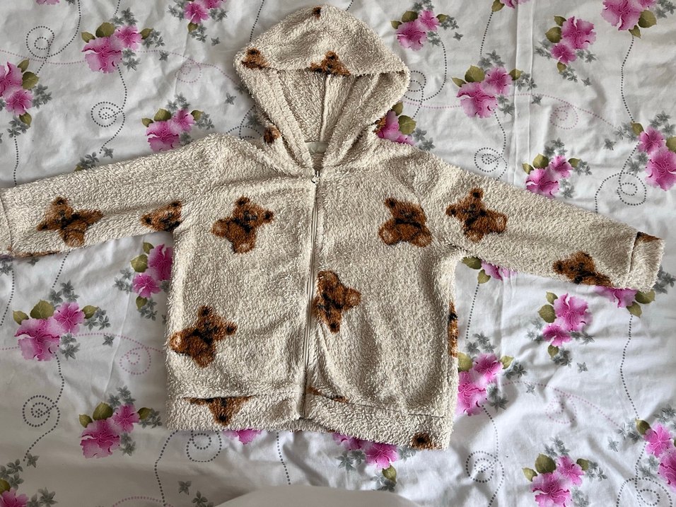 Kapüşonlu, fermuarlı ve bol kesim kız çocuk ceketi. Yumuşak ve sıcak kumaştan, peluş ayıcık desenli ve kahverengi pastel tonlarında, bohem ve retro sokak stili için uygun.