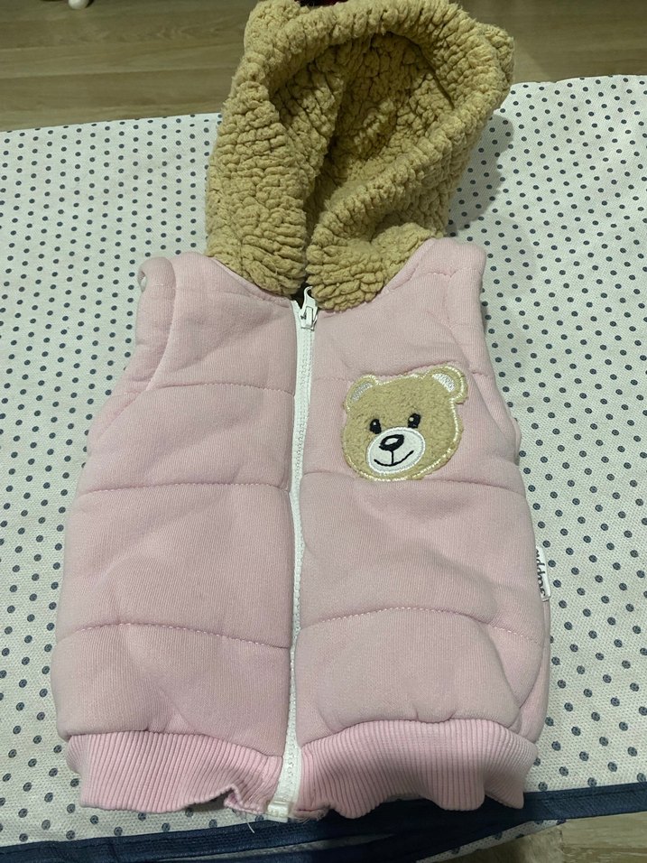 Kız çocukları için kapüşonlu, peluş astarlı, nakışlı ayıcık detaylı, pastel pembe renkli, fitted kesim yelek.
