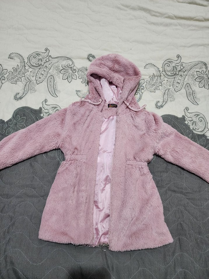Bu pembe kapüşonlu kız çocuk montu, yumuşak kürk detaylı kumaş ve bol kesim ile günlük sokak stiline uygundur. Düz, astarlı tasarıma sahiptir.