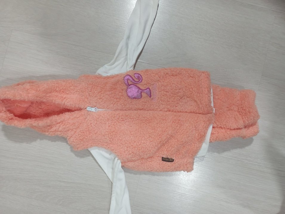 Pembe kapüşonlu, kürklü detaylı ve uzun kollu peluş yelek. Rahat kesimi ve sade tasarımıyla günlük şıklık sağlar.