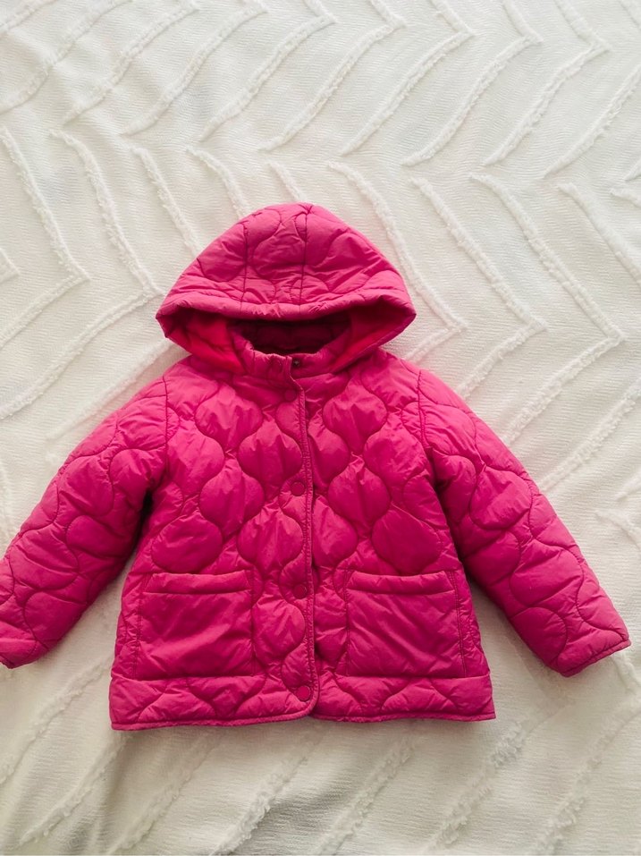 Pembe renkli, kapüşonlu ve düğmeli kız çocuk montu, yumuşak ve sıcak dokulu kumaştan, sade ve cepli tasarımla.