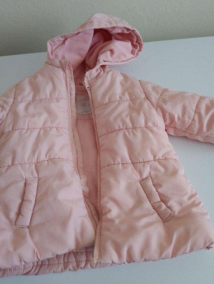 Kapüşonlu, fermuarlı ve pembe renkte, yumuşak ve sıcak dokulu kız çocuk montu.