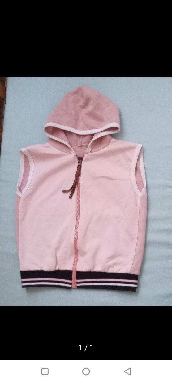 Kız çocukları için kapüşonlu, fermuarlı, pastel pembe renkli yumuşak ve sıcak kumaştan yapılmış, kollu olmayan, fitted kesim yelek. Alt kısmında kontrast çizgili bant bulunur.