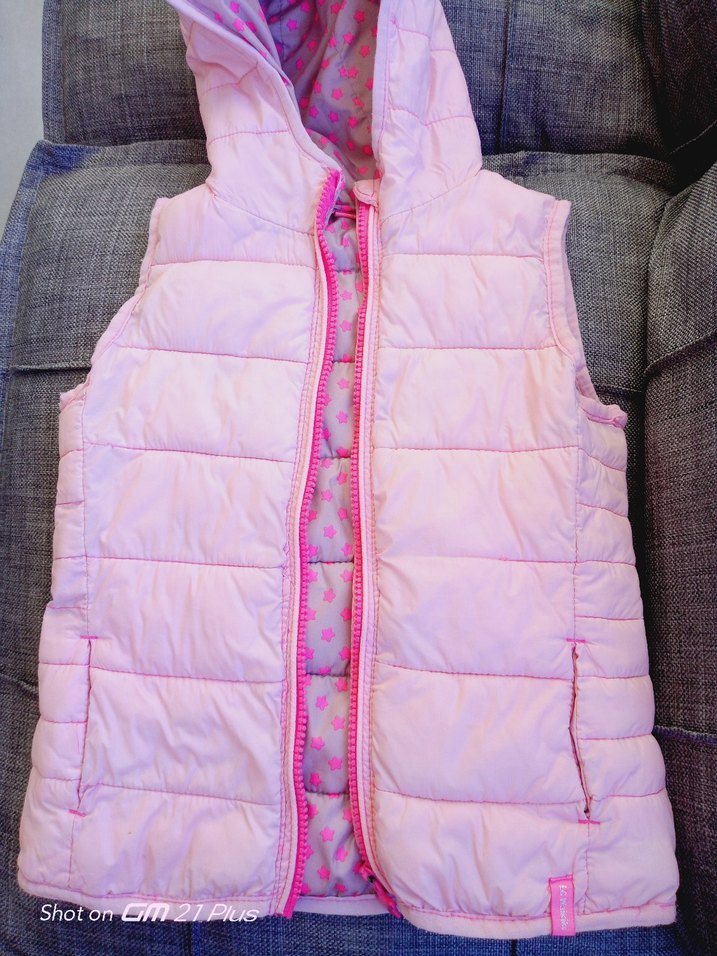 Kız çocukları için pastel pembe renkli, kapüşonlu ve fermuarlı, yumuşak ve sıcak kumaştan yapılmış, kolu olmayan dar kesim yelek. Sokak stili için uygun.