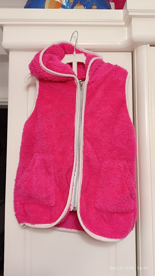 Kız çocukları için kapüşonlu, fermuarlı, kolsuz ve dar kesim yelek. Yumuşak ve sıcak kumaştan, canlı pembe renkte, iki ön cepli, sade ve sokak stili için uygun.