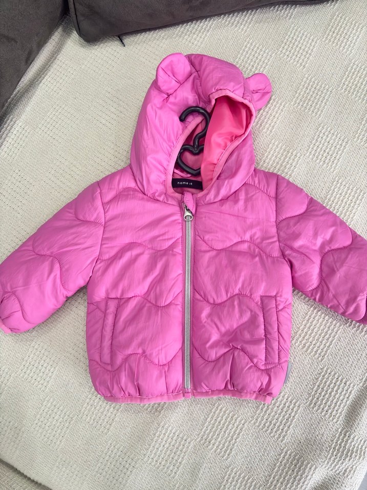 Kız çocukları için kapüşonlu ve kulak detaylı, yumuşak ve sıcak kumaş astarlı pembe mont. Canlı renkli sokak stili ve ön fermuarlı.