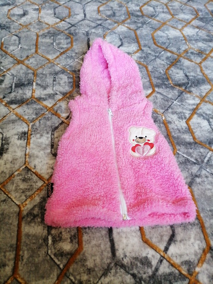 Pembe kapüşonlu, kolsuz ve yumuşak kürk dokulu yelek. Göğüs kısmında işlemeli ayıcık deseni ve dar kesim, sokak stili.