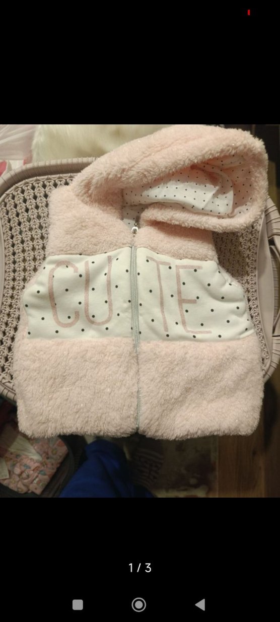 Kız çocuklar için kapüşonlu, pembe kürk detaylı, ön fermuarlı ve nakışlı 'CUTIE' yazılı beyaz panelli yelek. Rahat ve sade tasarım sunar.