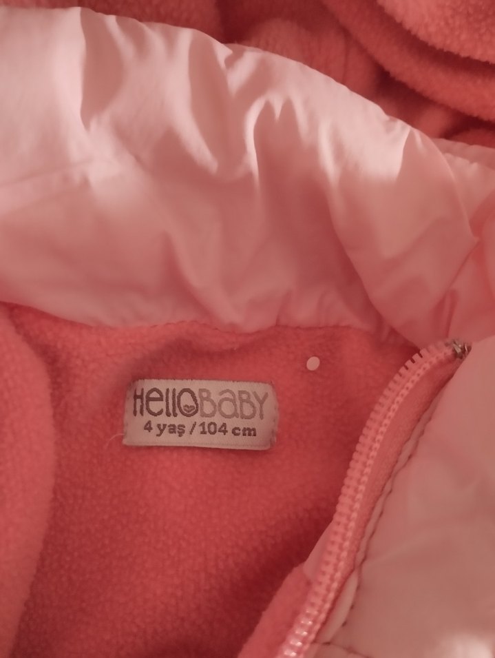 Kız çocuklar için kapüşonlu, fermuarlı, pastel tonlarda baskılı pembe mont. 4 yaş/104 cm bedenindedir. ❄️