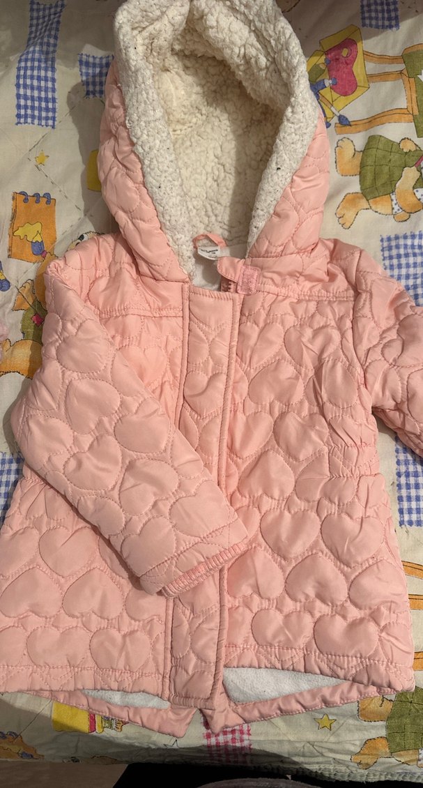 Kız çocukları için kapüşonlu, kalp desenli nakışlı, yumuşak kürk detaylı pembe mont. Sıcak tutan dokusu ile serin havalar için uygundur.