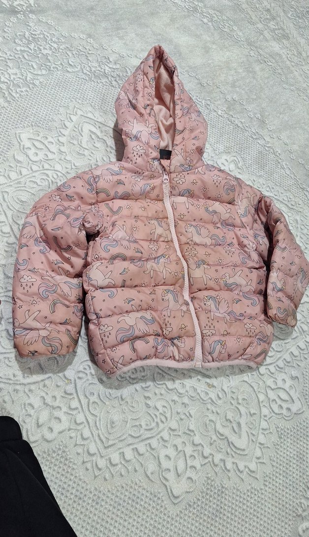 Kız çocukları için kapüşonlu, kürk detaylı, yumuşak kumaştan yapılmış, pastel pembe renkli ve desenli dar kesim mont. Trendy günlük stil için uygundur. ılk bahar sonbahara uygun lekeleri var hıc denemedim dolapta dura dura boyle oldu sanırım. onun ıcın uygun verıyorum