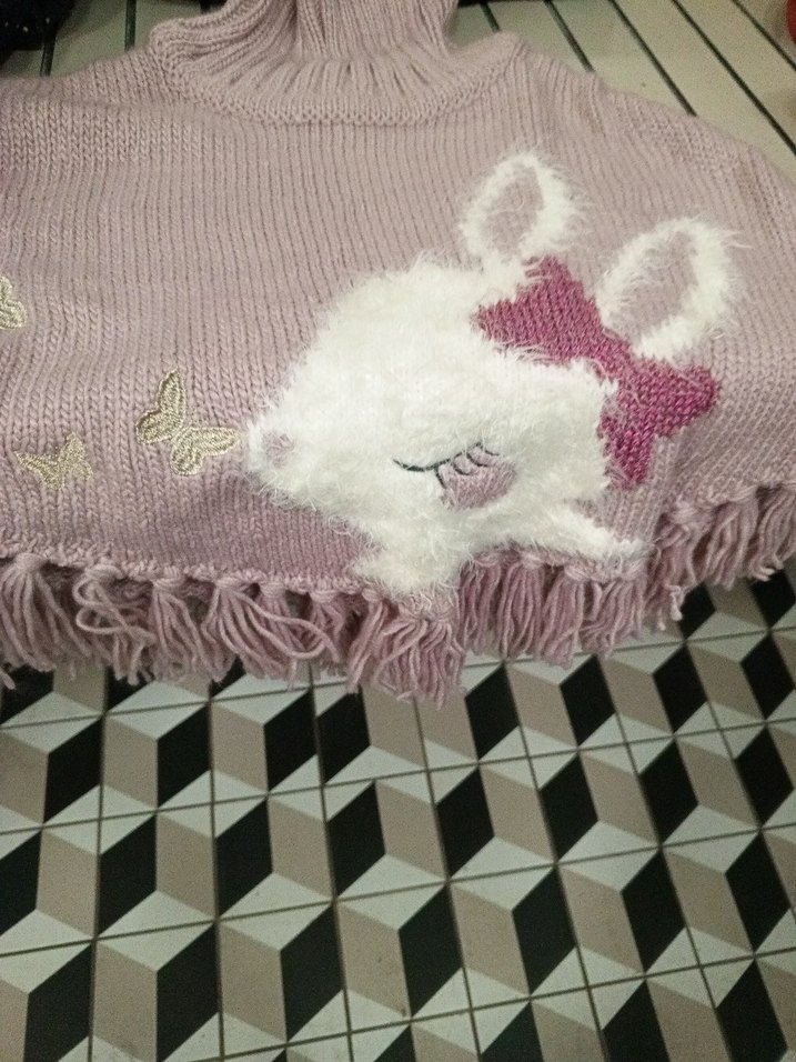 Pembe pastel renkte, kapüşonlu ve askılı kollu, bol kesim kız çocuk pançosu. Örgü kumaş üzerinde işleme tavşan ve kelebek desenleri bulunur.