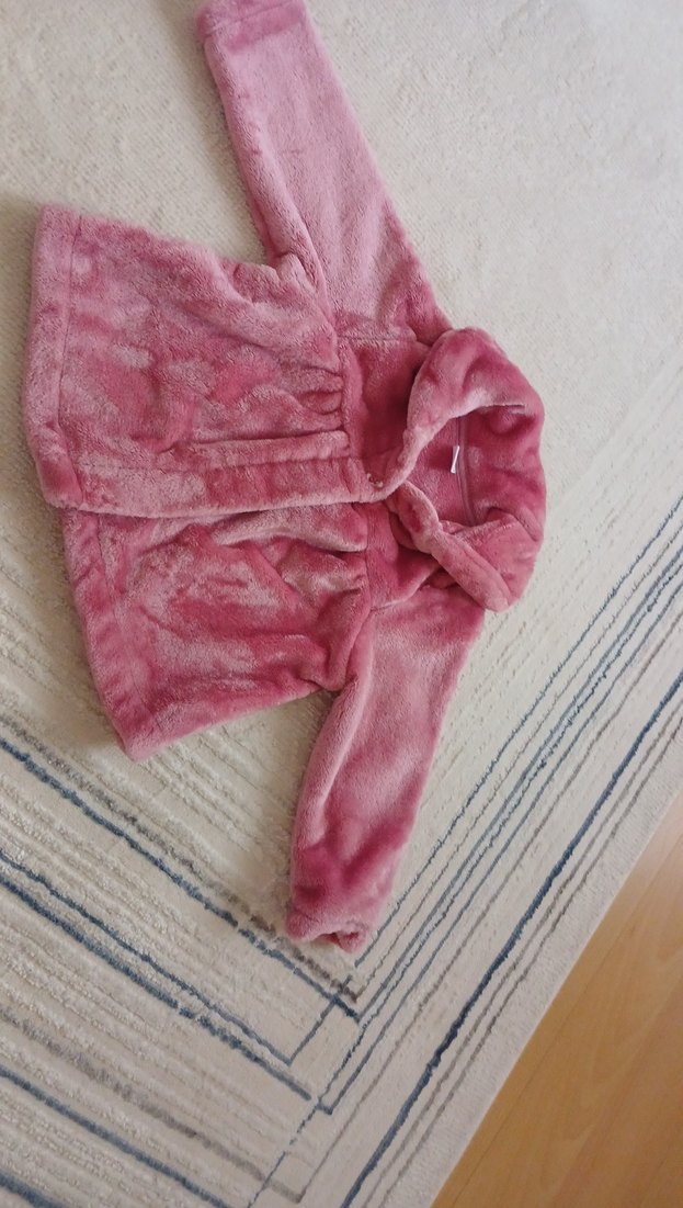 Kapüşonlu, bol kesim pembe ceket, yumuşak peluş ve hafif batik desenlidir.