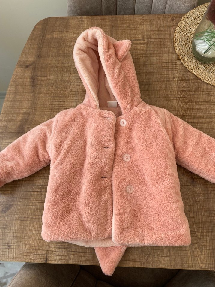 Kız çocukları için kapüşonlu, yumuşak ve sıcak peluş kumaştan yapılmış pembe mont, düz ve sade bir tarz sunar.