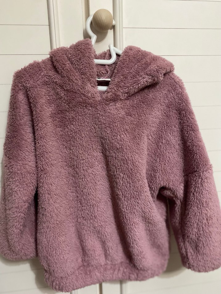 Kız çocuklar için kapüşonlu, uzun kollu ve bol kesim pembe peluş sweatshirt. Yumuşak, kürk detaylı kumaştan üretilmiştir ve sıcaklık sağlar.