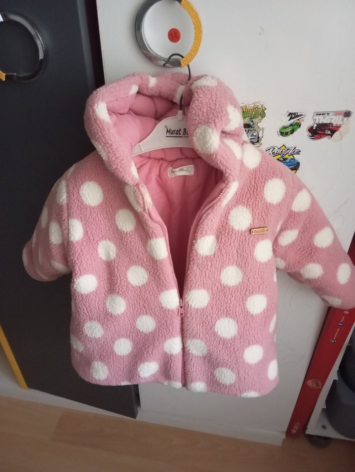 Kız çocuklar için kapüşonlu, kürk detaylı ve beyaz puantiyelerle süslenmiş pembe, yumuşak ve sıcak kumaştan yapılmış dar kesim mont.çok az kullanıldı. çok kalın sıcak tutuyor