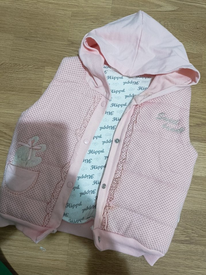 Bu pembe triko kız çocuk yeleği, straplez yaka ve baskılı iç astar ile tasarlanmıştır. Kapüşonlu ve düğmeli, yumuşak ve sıcak dokusu vardır.