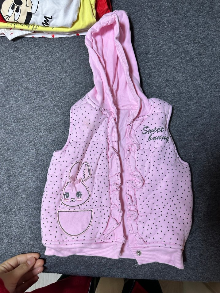 Fitted kesim, kapüşonlu, pembe renkli triko kumaştan yapılmış, tatlı tavşan baskılı kız çocuk yeleği.