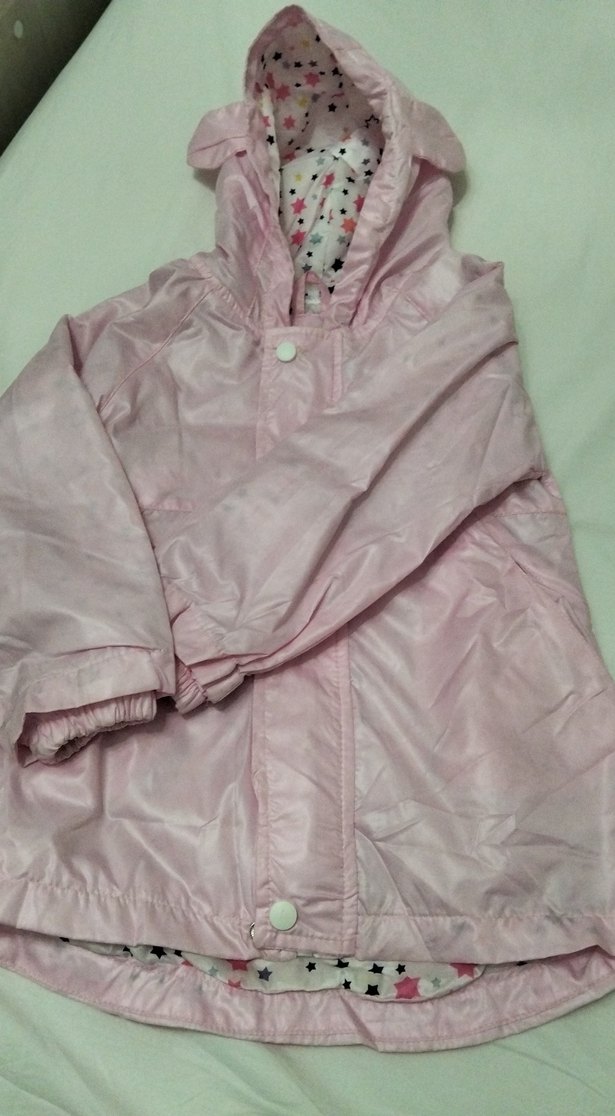 Pastel pembe renkte, kapüşonlu ve düğmeli kız çocuk yağmurluğu. Sentetik kumaştan, rahat ve bol kesim, günlük sokak stili için uygun. hiç giyilmedi